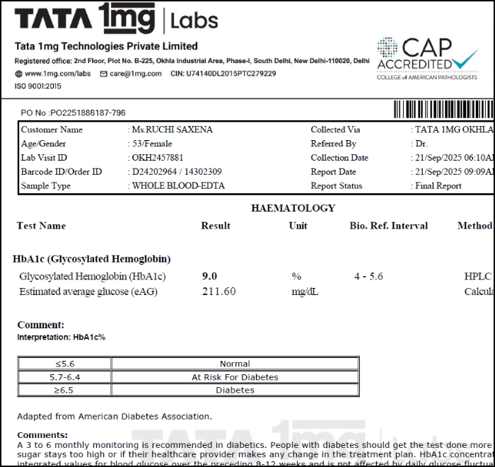 HbA1c reduced to 9, Triglycerides to 200, FBS dropped to 120, constipation improved 60–70%, digestion 100% better and energy levels improved.