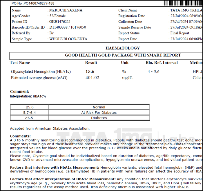 High HbA1c (15), High Triglycerides (376), Fasting Blood Sugar 200, Constipation, Tingling in Hands & Feet, Low Energy and Stress