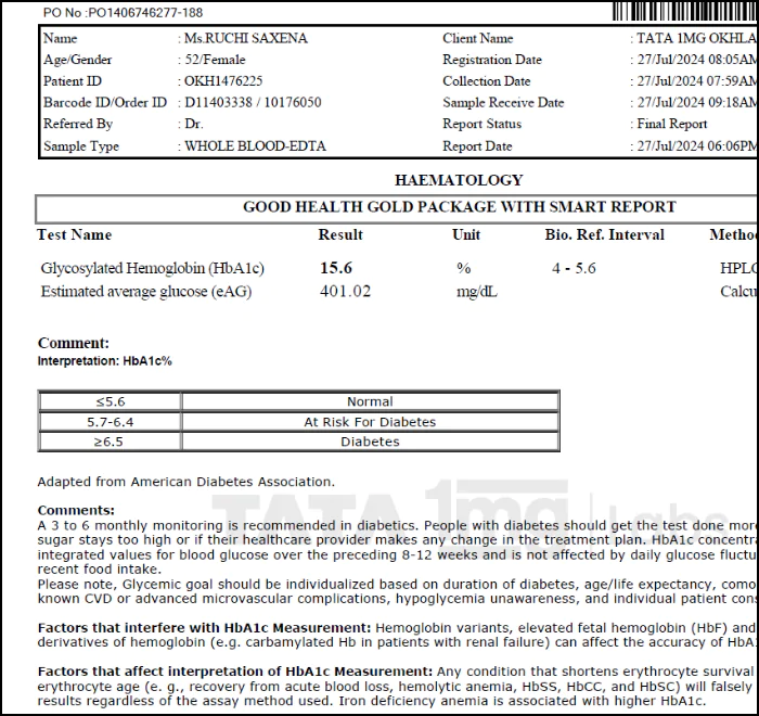 High HbA1c (15), High Triglycerides (376), Fasting Blood Sugar 200, Constipation, Tingling in Hands & Feet, Low Energy and Stress