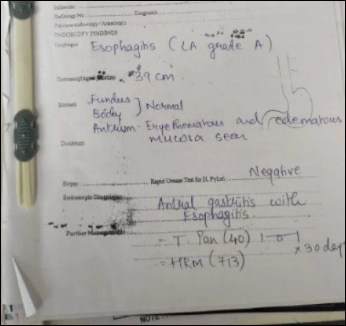 Acid reflux, nausea, vomiting, loss of appetite, bloating, incomplete evacuation, Antral gastritis, GERD, Esophagitis and H. Pylori+.